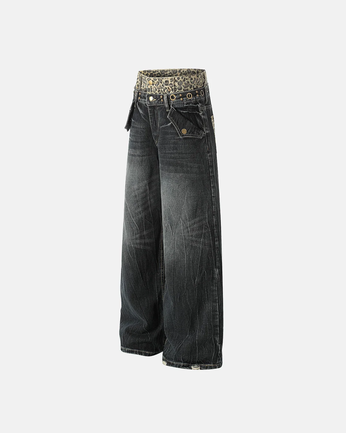 Leopard Pactchwork Double Waist Baggy Jeans | Inflation Streetwear